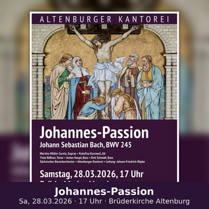 Die Altenburger Kantorei bringt am Samstag, 28. März 2026 um 17 Uhr Johann Sebastian Bachs Johannes-Passion zur Aufführung – ein musikalisches Passionsgeschehen von eindringlicher Dramatik und großer innerer Tiefe. Eintritt: 20 € / ermäßigt 15 € /…