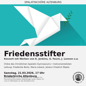 Die Spalatinchöre Altenburg gestalten am Samstag, 21. März 2026, um 17 Uhr in der Brüderkirche Altenburg ein Konzert unter dem Titel „Friedensstifter“. Auf dem Programm stehen Werke von Karl Jenkins, Gabriel Fauré, John Lennon und weiteren…