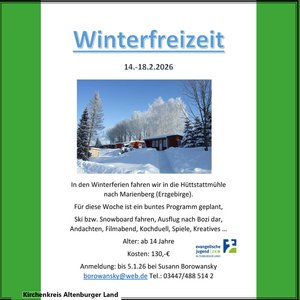 In den Winterferien geht’s für Teens ab 14 in die Hüttstattmühle nach Marienberg (Erzgebirge). Auf dem Programm: Ski- bzw. Snowboardfahren, Ausflug nach Bozi Dar, Andachten, Filmabend, Kochduell, Spiele und Kreatives. Kosten: 130 €. Anmeldung bis…