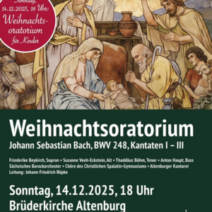 Am Sonntag, 14. Dezember 2025, lädt die Altenburger Kantorei zu Johann Sebastian Bachs Weihnachtsoratorium (Kantaten I–III) in die Brüderkirche Altenburg ein. Bereits am Nachmittag gibt es unter dem Titel „Weihnachtsoratorium für Kinder“ ein…