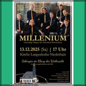 Am Samstag, 13. Dezember 2025, 17 Uhr, erklingt in der Kirche Langenleuba-Niederhain festliche A-cappella-Musik aus aller Welt. Ehemalige Sänger des Dresdner Kreuzchors präsentieren ihr Programm „MILLENIUM – Geborgen im Klang der Weihnacht“.